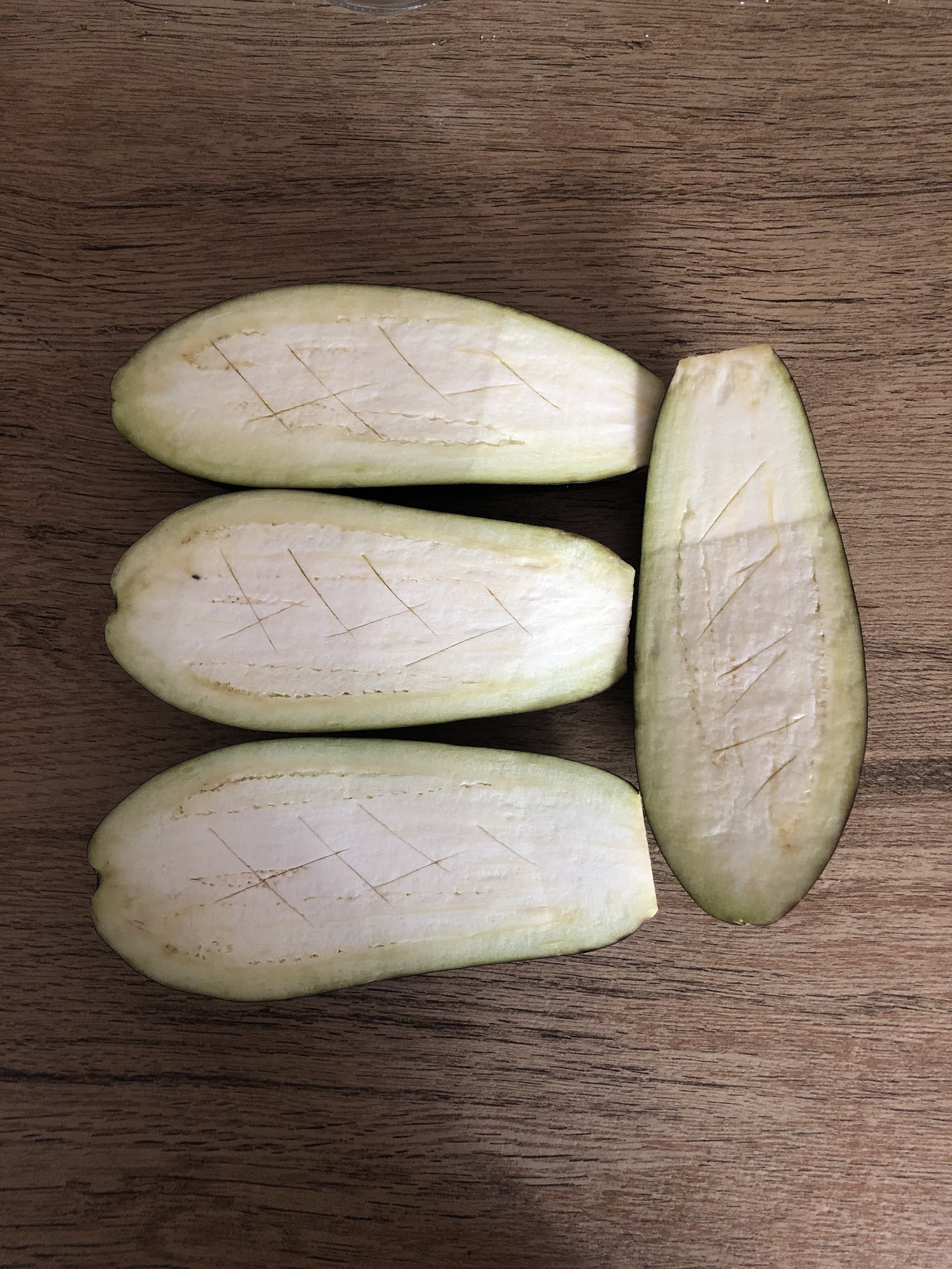 PASO 1. Cortar las berenjenas por la mitad y hacer pequeños cortes en el centro.