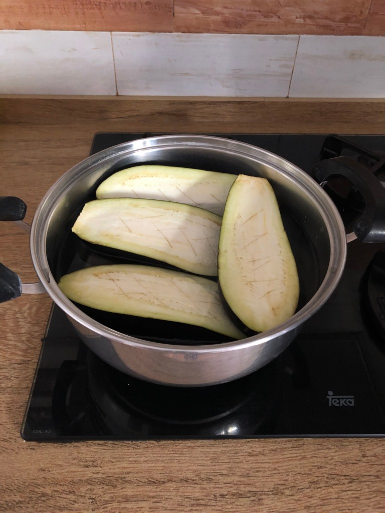 PASO 2. Cocer las berenjenas hasta que estén tiernas, ponerlas a escurrir y esperar a que enfríen.