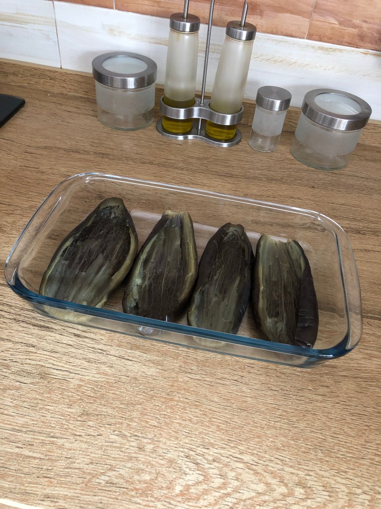 Necesitaremos 2 berenjenas, con las que nos saldrán 4 raciones. Yo suelo comer 2 una noche y otras 2 otra noche, caliento al microondas y listo.