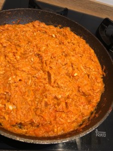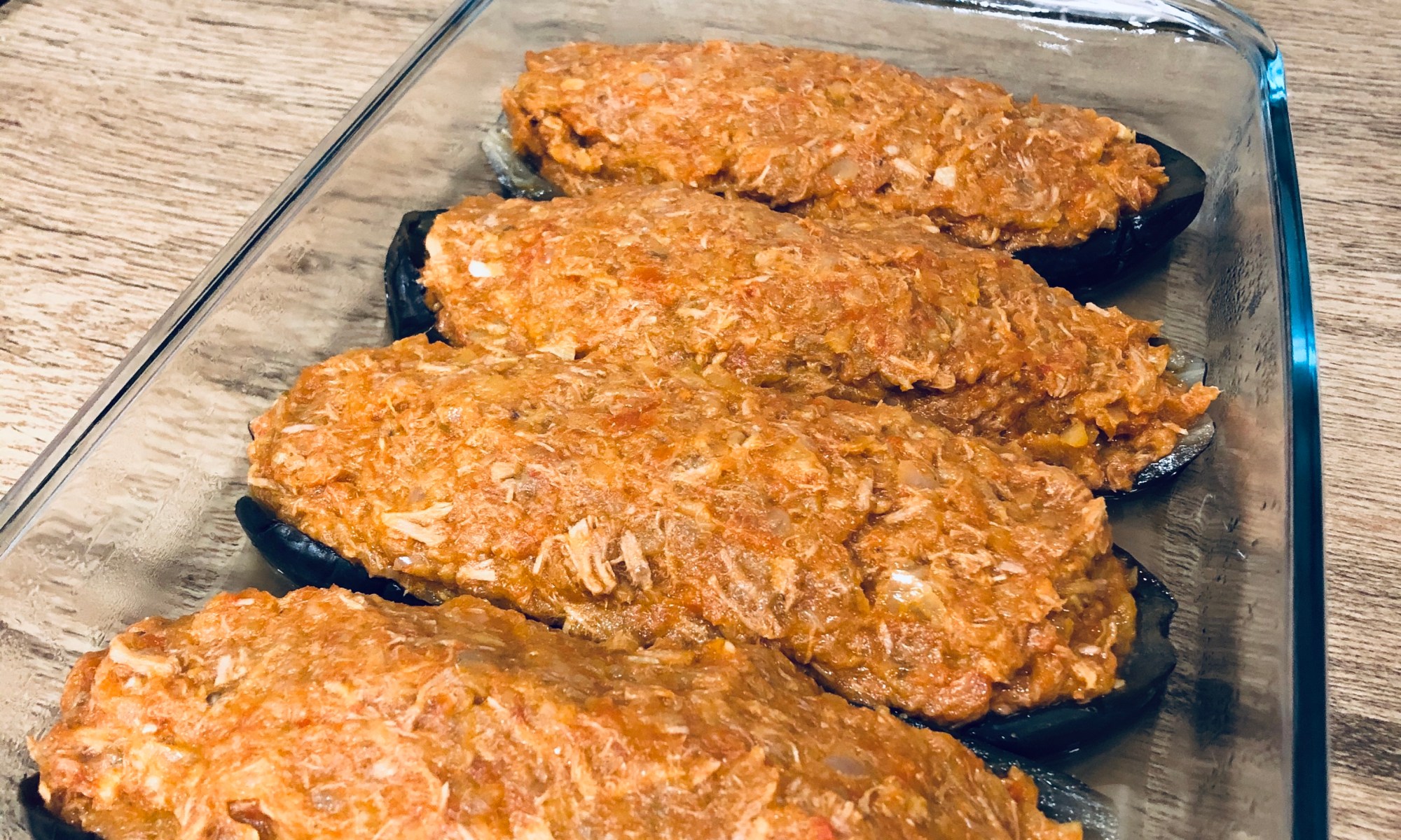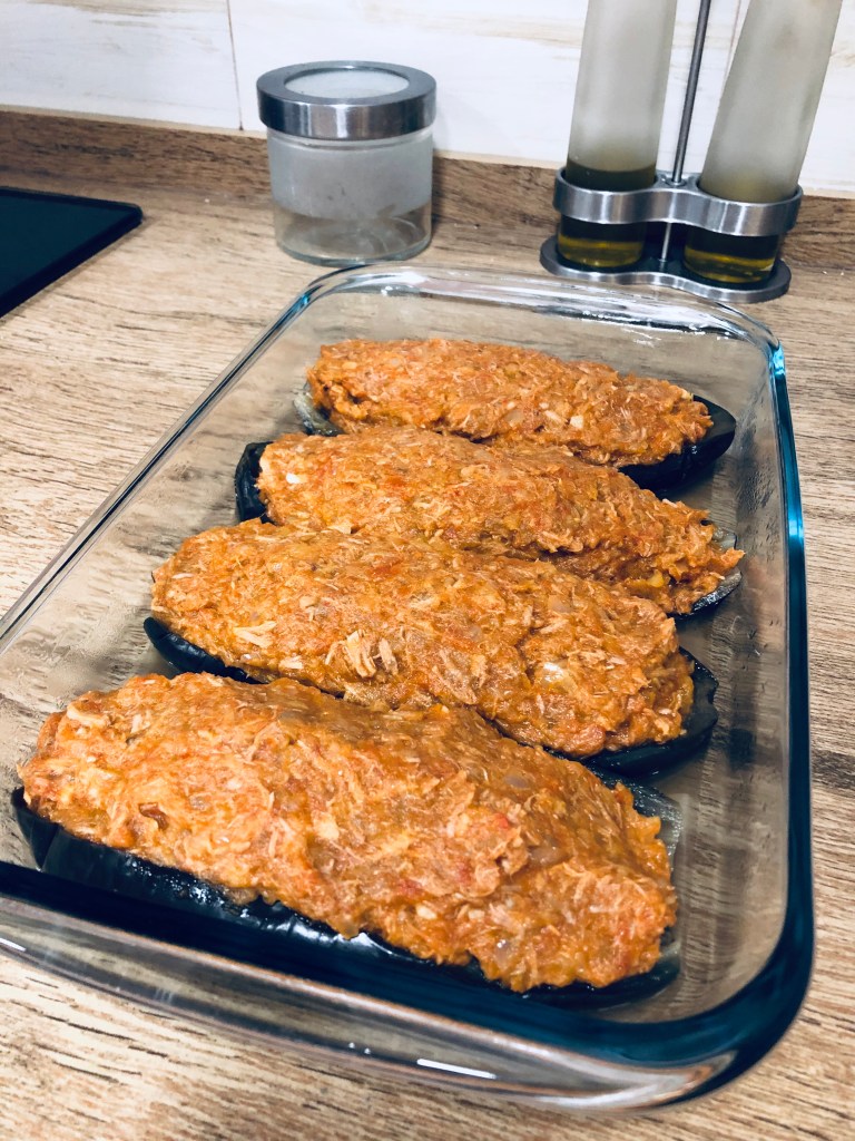 PASO 4. Hacer el relleno de la berenjena. Picar los ajos, la cebolla y refreír con aceite de oliva (yo utilizo 6 cucharaditas). Al refrito le añadimos la berenjena molida y lo movemos todo durante unos minutos. A continuación, escurrimos las latas de atún y lo desmenuzamos para añadirlo a la mezcla. Volvemos a moverlo todo durante varios minutos y añadimos la sal (utilizo sal del Himalaya y poca cantidad) junto con el tomate (yo utilizo una receta casera que os dejaré por aquí más adelante). Por último, mover todo a fuego medio hasta que veamos que está hecho (unos 15 minutos).