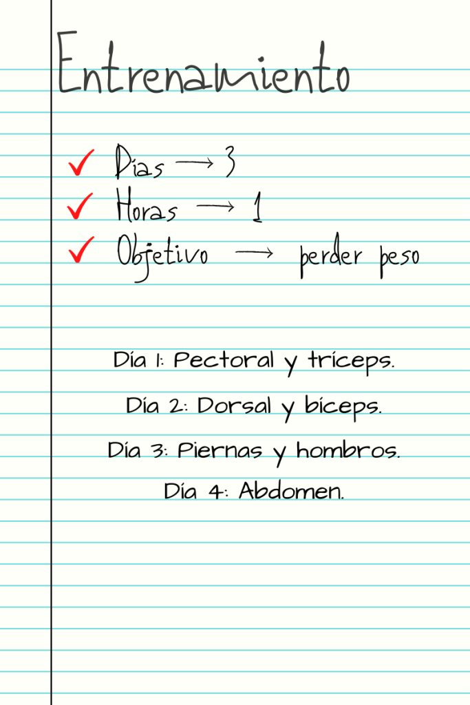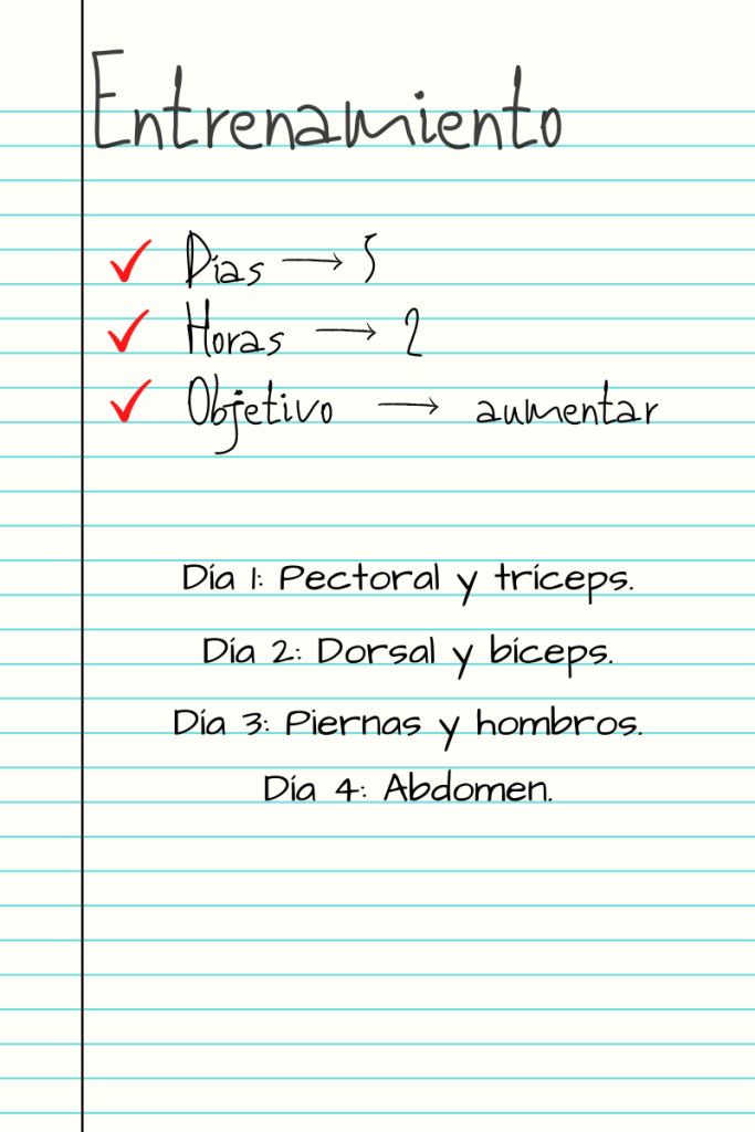 Bien, ya tendría en mi papel los días que voy a entrenar, el tiempo que dedicaré cada día y cuál será mi objetivo. Vayamos a la última parte del plan, como organizar el músculo o los músculos que entreno cada día. Realmente puedes organizarte como quieras, lo importante es entrenar correctamente, concentrarte en el músculo cuando lo trabajas y dedicarle más tiempo a esa parte que desde tu punto de vista necesita ser más trabajada.