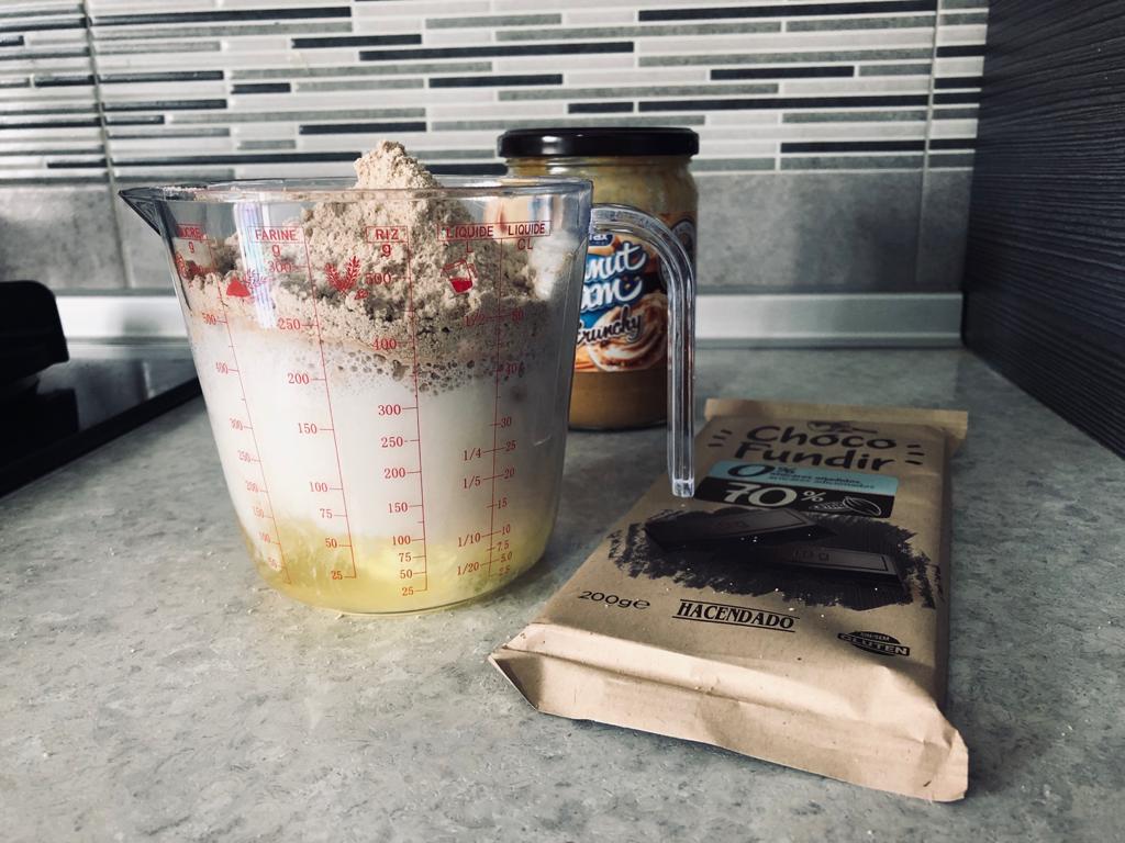 PRIMER PASO. En un vaso de batir echamos todos los ingredientes, a excepción de la crema de cacahuetes y el chocolate.