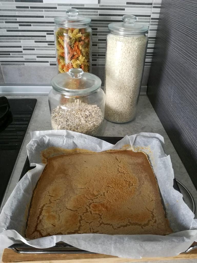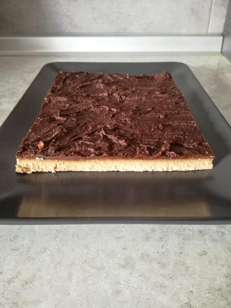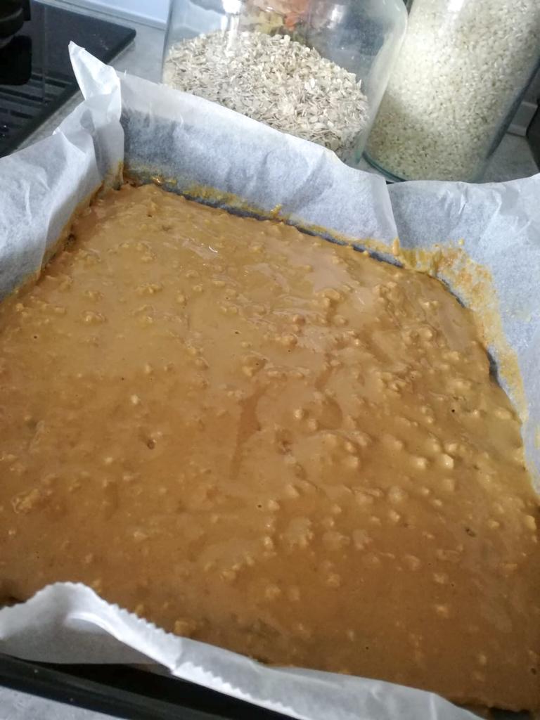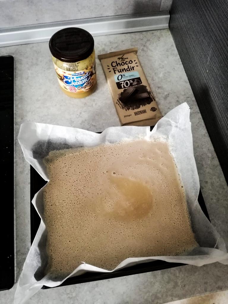 TERCER PASO. Lo sacamos del horno y echamos una capa de crema de cacahuetes. IMPORTANTE, mirar que en los ingredientes ponga 100% cacahuete natural triturado (las listas de ingredientes mientras más cortas, mejor).